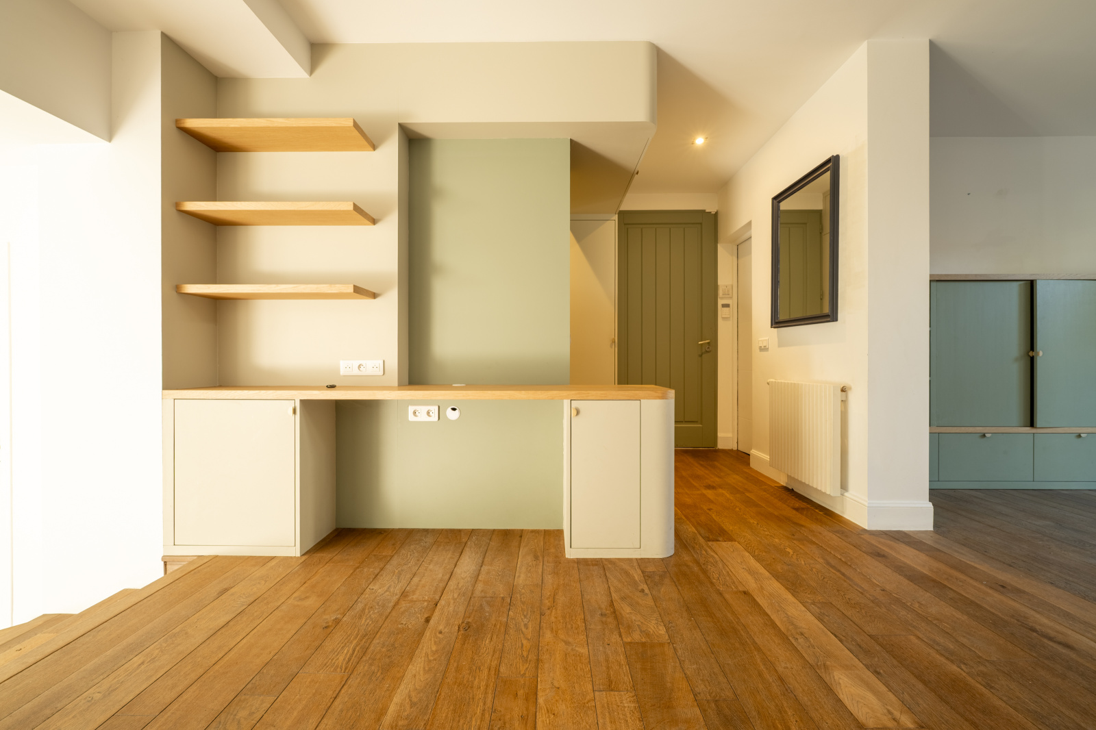 -Rez-de-chaussée avec terrasse : entrée, vaste pièce de vie d’environ 55 m² avec cuisine équipée, coin repas et salon ouvrant sur terrasse exposée Est, WC, rangements.