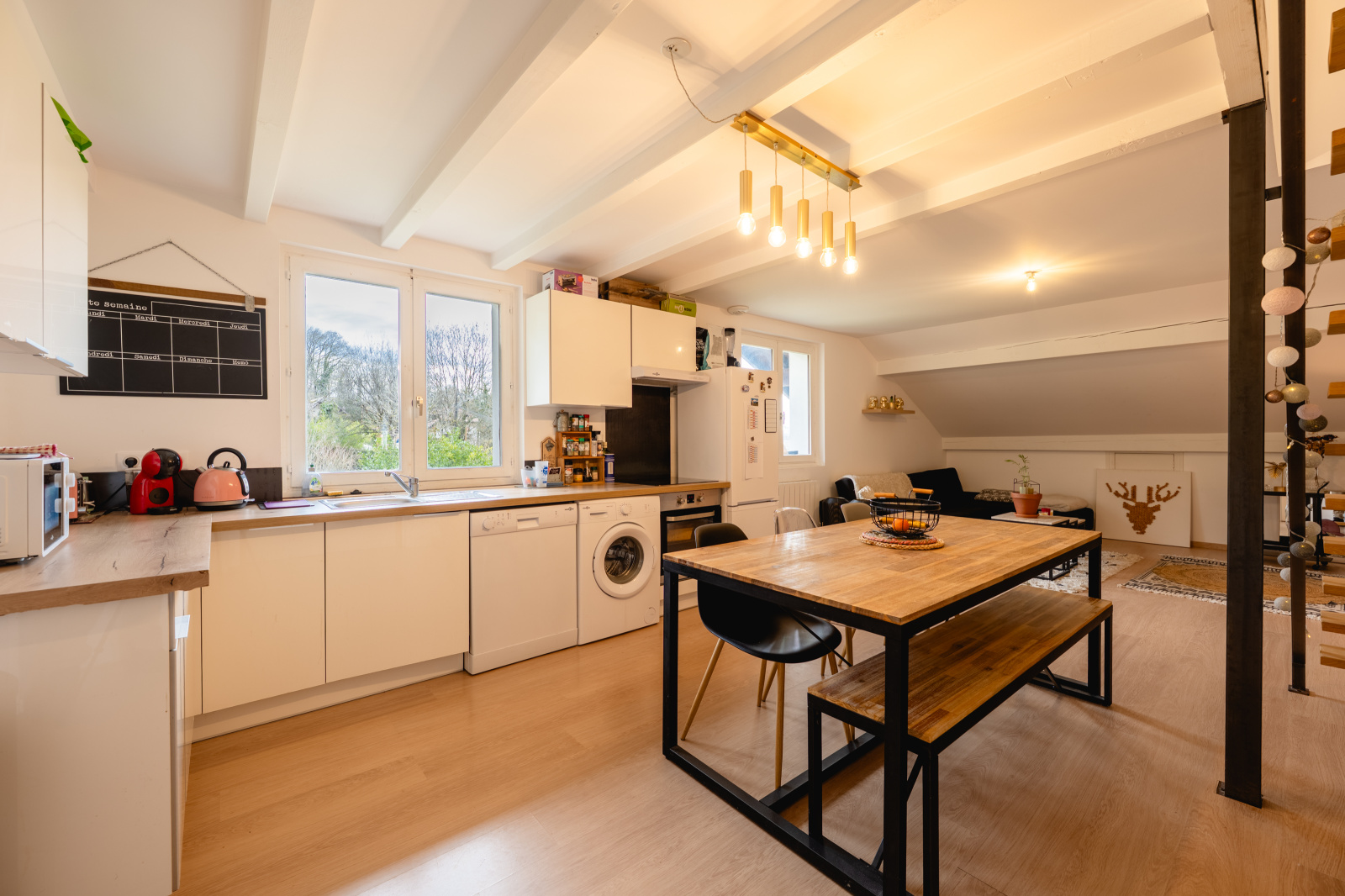Vaste pièce de vie lumineuse avec coin cuisine équipée