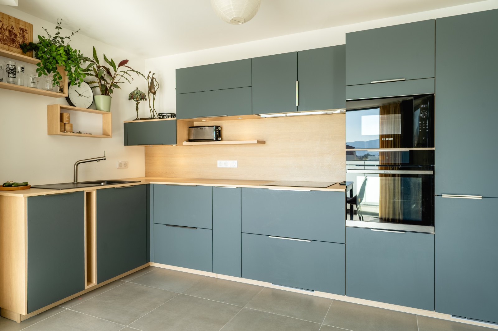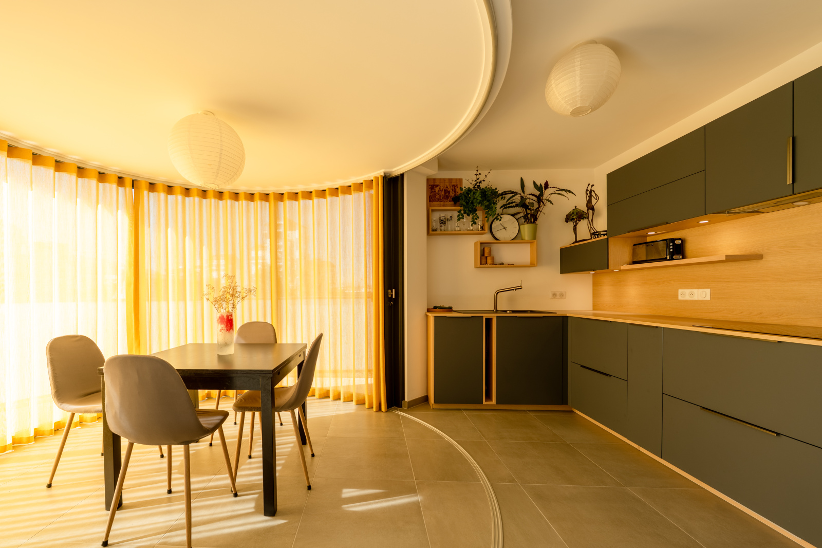 Une pièce de vie lumineuse équipée du Lumicène, ouvrant sur une terrasse avec vue dégagée.