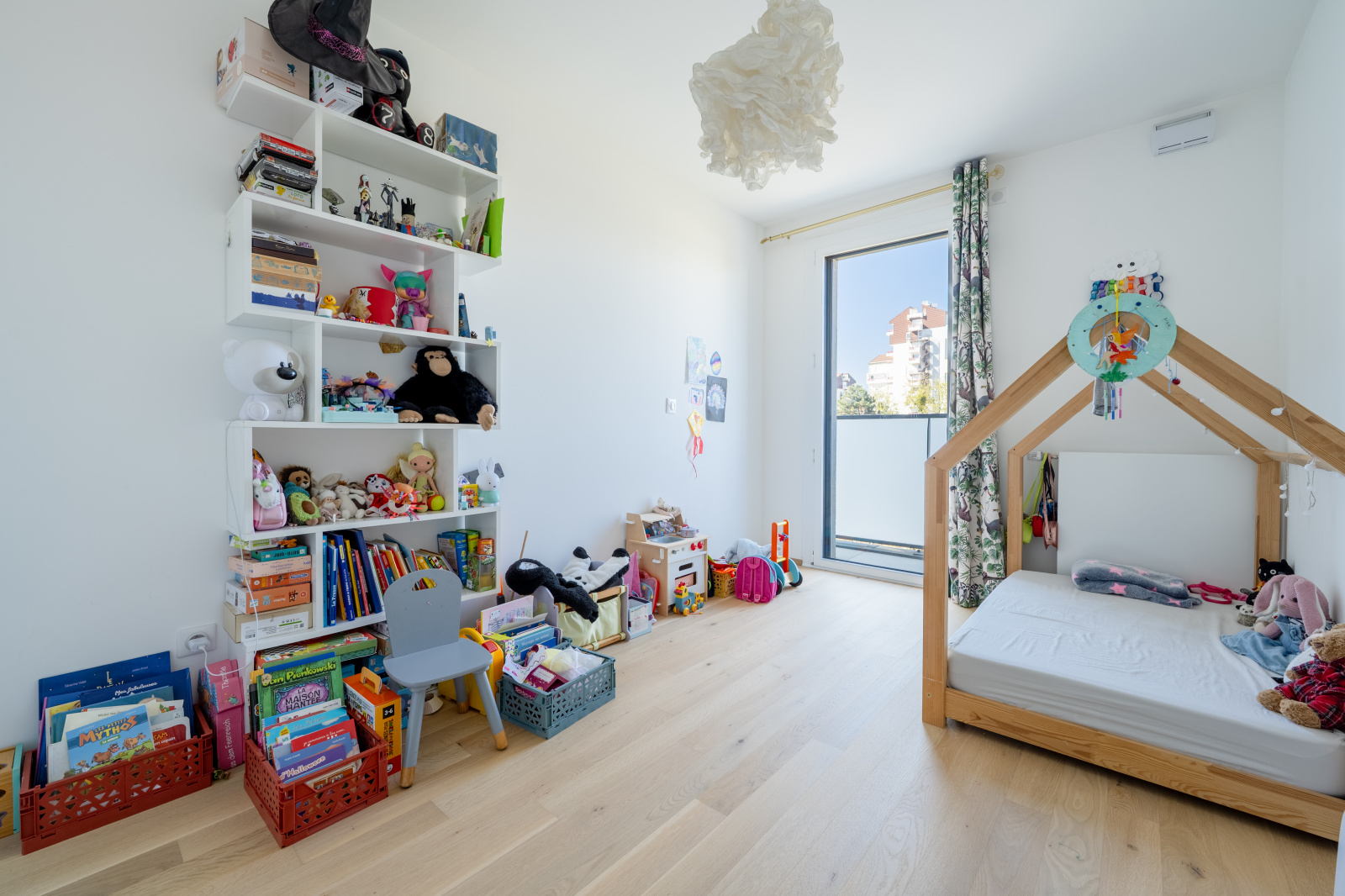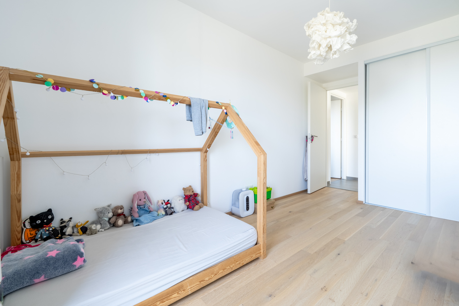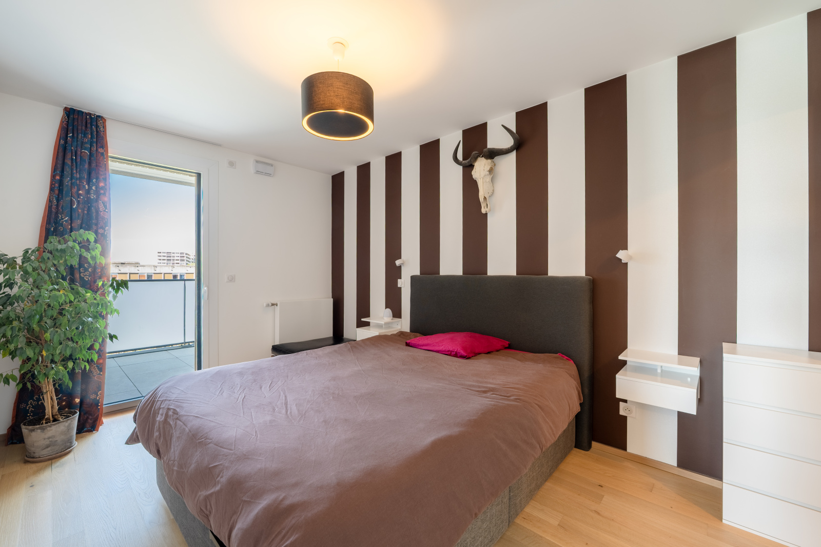 Deux chambres avec placards, une suite parentale, WC séparés, prestations haut de gamme et équipements modernes : parquet massif, cellier sur le palier, et stationnement en sous-sol complètent ce bien.