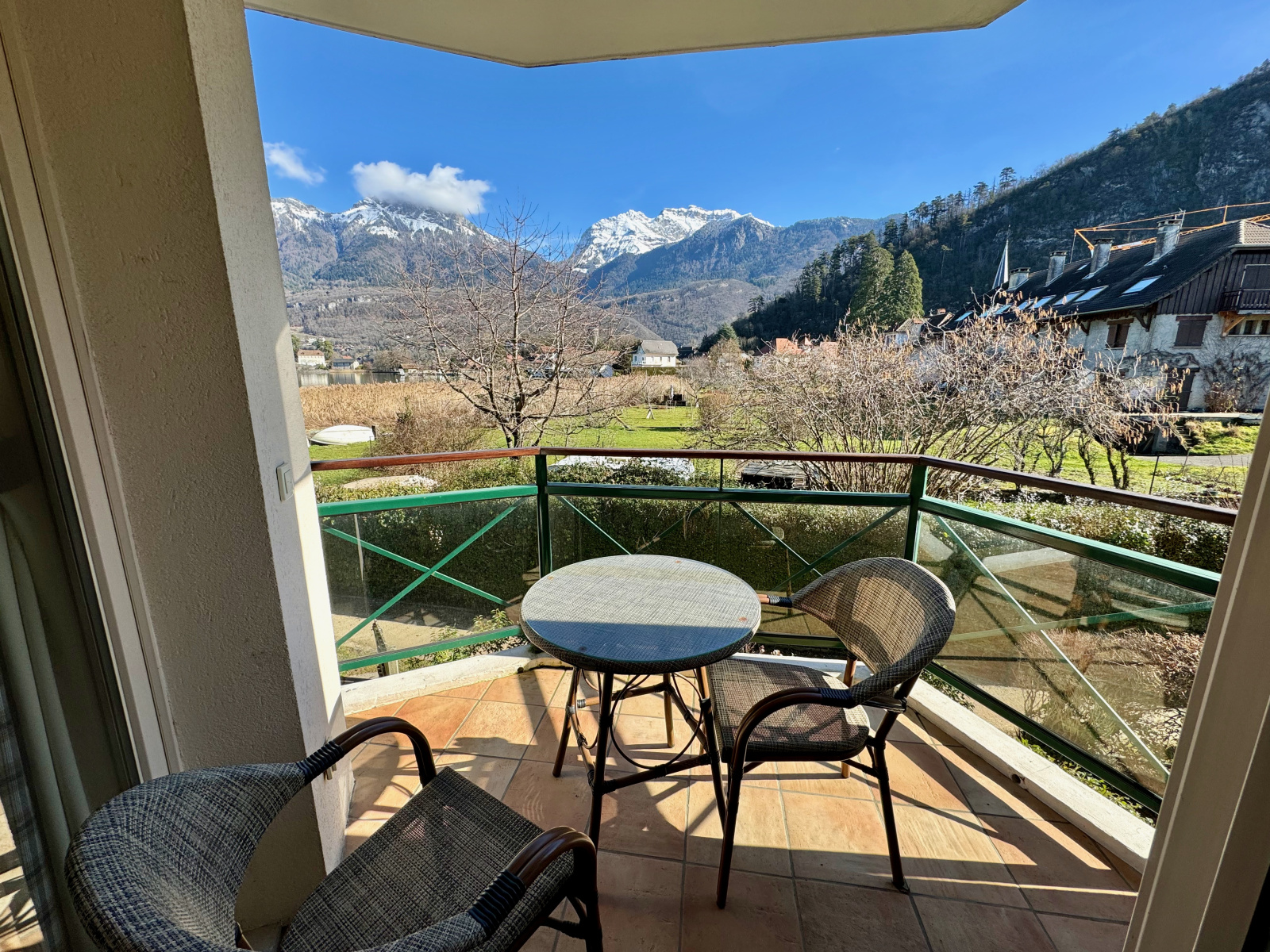 Duingt (74410)Nouveau ! Au sein d'une des plus belles copropriété de la Rive Ouest du Lac d'Annecy, au 1er étage de la résidence pieds dans l'eaux, studio entièrement équipée ambiance "chalet", vieux bois , vue lac et montagnes, accès direct au Lac , terrasse, cave ... Idéal pied à terre ou investissement locatif.
