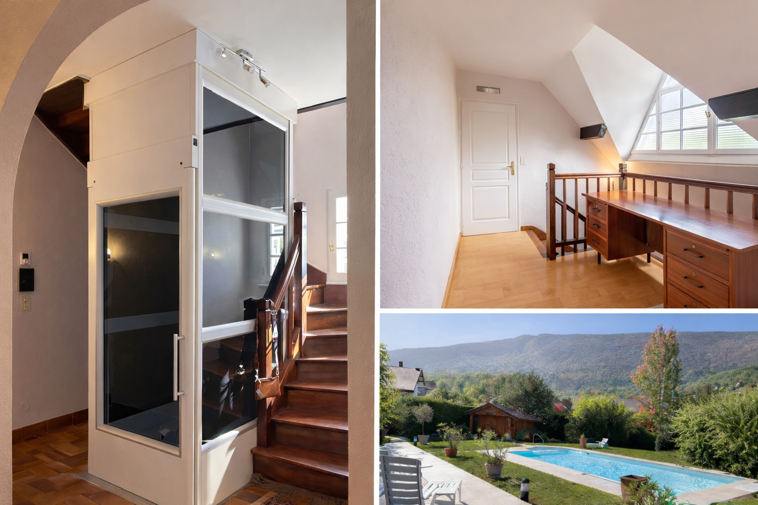 Elle propose une vaste pièce de vie de 45 m², une exposition Sud-Ouest, ainsi que 5 chambres dont une de plain-pied. Un ascenseur privatif complète le confort de la maison.