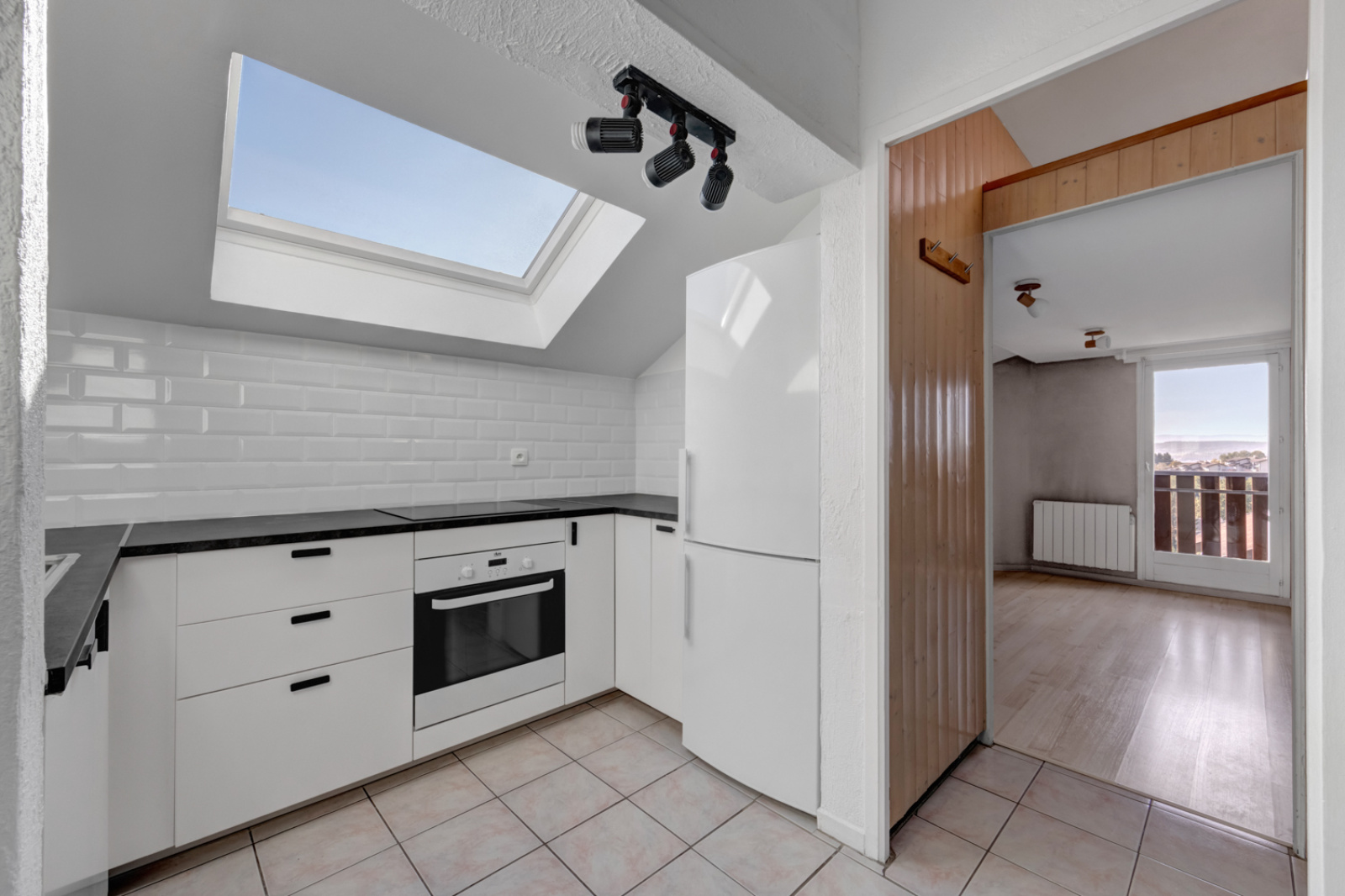 Annecy-le-Vieux (74940)Nouveau ! Annecy le vieux secteur IUT , au sein d'ue résidence de qualité des années 90 au dernier étage, vaste T2 bis de 75m2 utiles traversant avec balcon EST à la vue imprenable sur le parmelan, belle hauteur sous plafond, cuisine et salle de bains équipées, chauffage individuel, mezzanine /bureau , 1 chambre, cave en annexe...