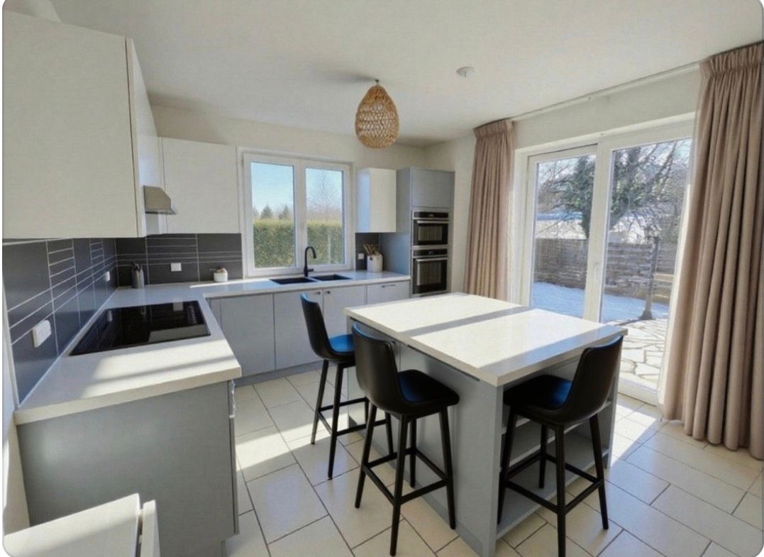 Belle pièce de vie lumineuse avec cuisine ouverte moderne et équipée,