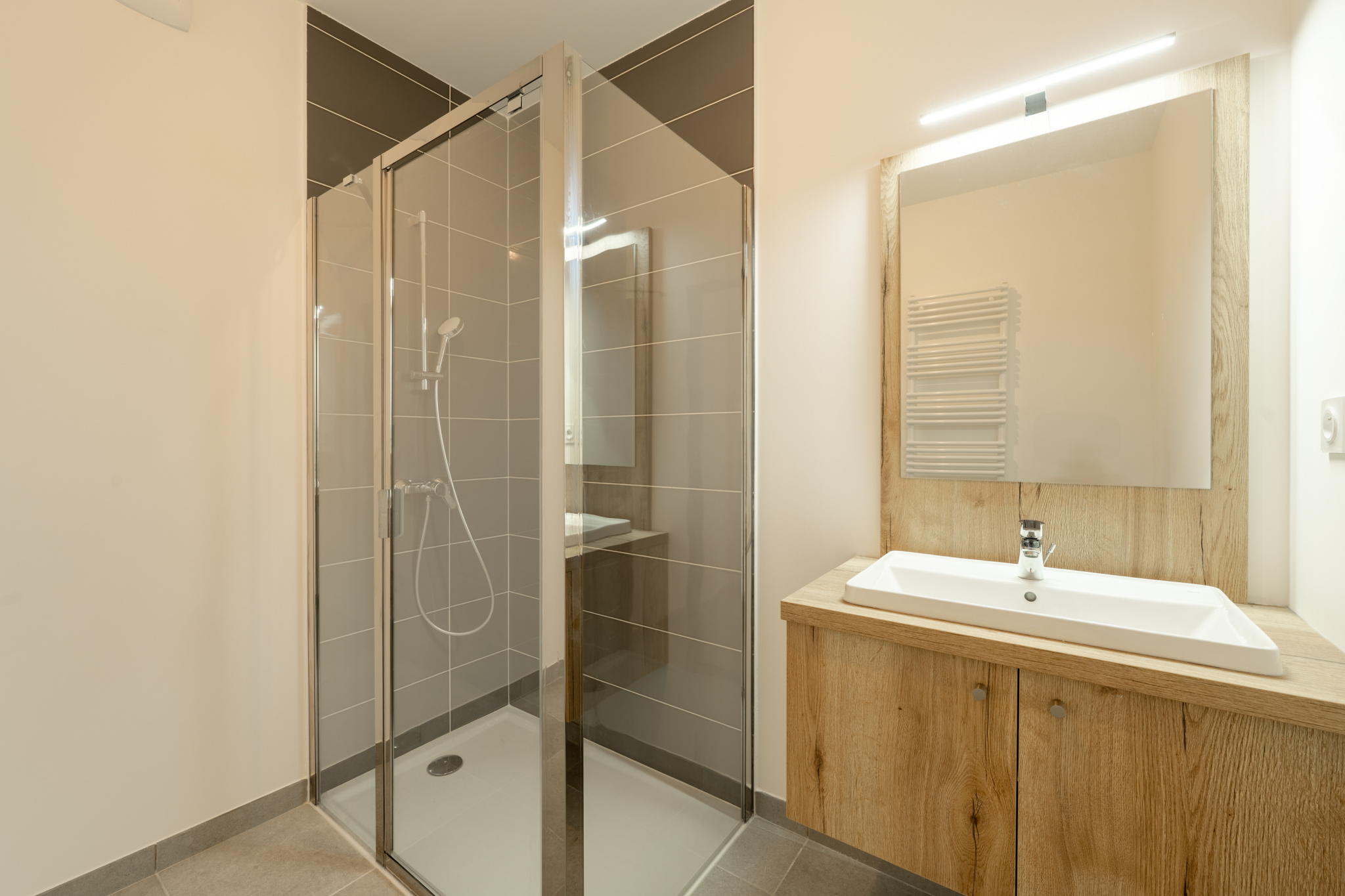L’appartement dispose d’une cuisine équipée (groupe Fournier), ainsi que d’un chauffage individuel au gaz de ville. Les matériaux de qualité sont au rendez-vous : carrelage 45x45 en grès cérame dans les pièces de vie et parquet contrecollé massif dans la chambre, offrant à l’ensemble une ambiance moderne et chaleureuse.